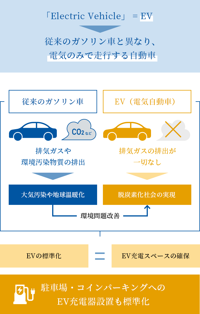 温暖化対策をはじめとする、世界の環境問題や技術の進歩によって大きな変化をもたらす可能性のあるEV(電気自動車)は、ガソリンではなく電気を動力源とした充電が必要となります。そのため、EV充電器が設置されている場所で充電をする必要があります。また、緊急時に蓄電池として使用できる為、災害時でも不安を解消してくれるツールのひとつでもあります。